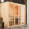 Toegankelijk en Veilig: Onze sauna is uitgerust met een voorgemonteerde dubbele vleugeldeur van 140 x 170 cm. Deze deur heeft kunstglazen panelen voor een vleugje elegantie en een veilig baardslot met 2 sleutels voor gemoedsrust.