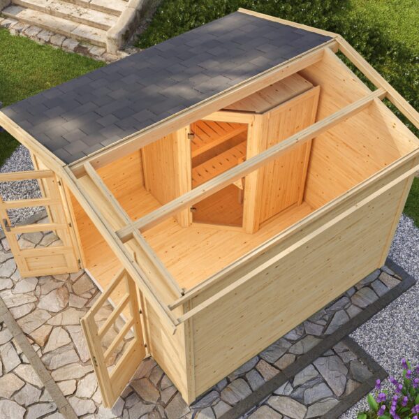 Een Dak Dat U Zelf Kiest: Het dak van de sauna is gemaakt van 16 mm massief hout met tand en groef, waardoor uitstekende isolatie en duurzaamheid gewaarborgd zijn. Het beste van alles is dat u de vrijheid heeft om uw eigen dakbedekking te selecteren, zodat deze perfect past bij uw persoonlijke stijl.