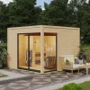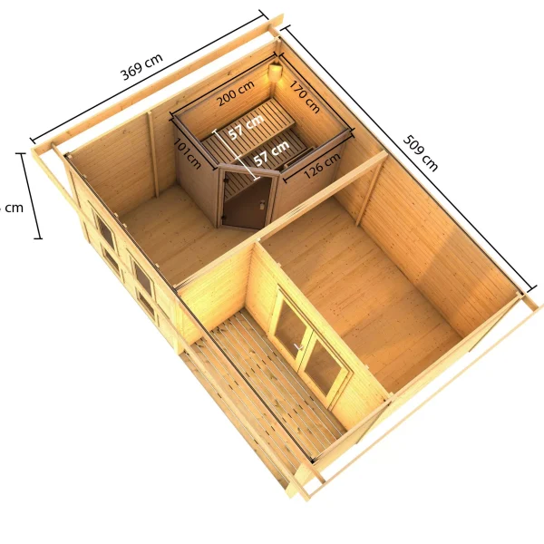 Onze saunahuisserie Ebro overtuigt door zijn grote voorkamer, die individueel kan worden gebruikt. Ook voor de binnensauna kunt u kiezen uit twee verschillende afmetingen. De binnensauna meet 225 x 190 cm met 3 ligbanken (SET B). Bij de levering zijn bovendien 2 ramen inbegrepen voor meer lichtinval.