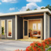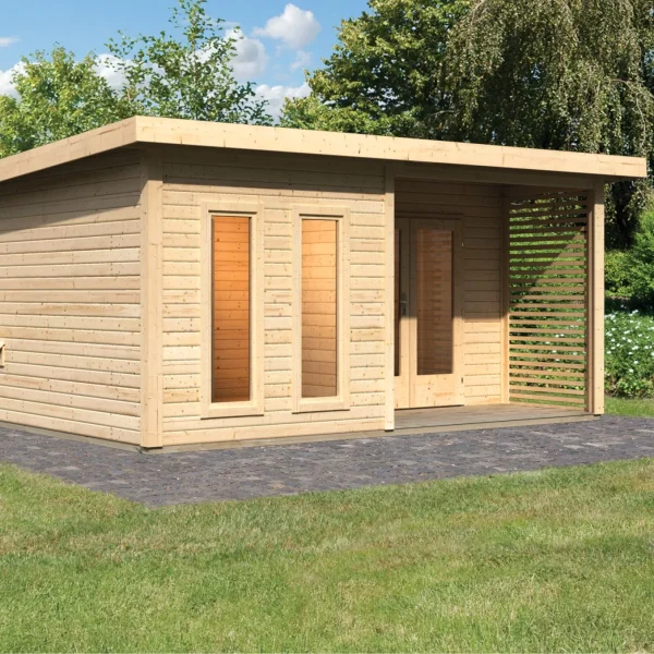 Het saunahuis heeft een wanddikte van 38 mm en wordt aan elkaar geschroefd met behulp van een plug-en-schroefsysteem. Hij heeft een buitenmaat van 509 x 369 cm en een hoogte van 253 cm. U betreedt de woning via een extra hoge glazen dubbelvleugeldeur met cilinderslot. Voor een moderne uitstraling heeft het saunahuis aan de randen een Chromeline hoekverbinding, waardoor randen optimaal verborgen blijven.