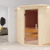 Onze systeembouwsauna van 68 mm dikke wandelementen biedt u een optimale prijs-prestatieverhouding en tegelijkertijd optimale isolatiewaarden. Dankzij de constructie van geprefabriceerde wandelementen is uw nieuwe sauna zeer snel op te bouwen en biedt u pure ontspanning. De wandelementen bestaan uit een frameconstructie van 42 mm dik kanthout waarin hoogwaardige minerale wolisolatie is aangebracht. Dit isolatiemateriaal wordt vervolgens bekleed met hoogwaardig Softline-profielhout van het beste Scandinavische sparrenhout en geeft dus geen indicatie welke kwaliteiten er onder de houten bekleding schuilgaan. In tegenstelling tot de 38 mm of 40 mm massief houten sauna’s zijn de achterkanten van onze 68 mm sauna’s niet zichtbaar. Net als de plafondelementen zijn deze alleen aan de binnenzijde bekleed met geprofileerd hout. Aan de buitenkant zit stevig hardboard. De sauna heeft een elegante en praktische vooringang.