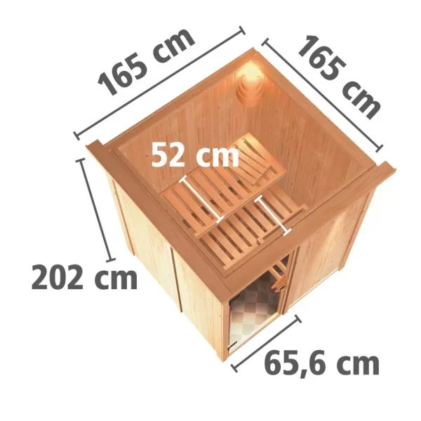 Met zijn buitenafmetingen van 151 cm x 151 cm en de resulterende binnenafmetingen van 136 cm x 136 cm biedt onze sauna voldoende ruimte voor alle eisen. De 2 ligstoelen zijn binnen gemonteerd op vierkante balken, die vanwege de systeemconstructie niet flexibel in hoogte zijn. Het onderste ligbed kan onder de bovenste bank worden geschoven, waardoor het interieur ruimer aanvoelt en er ruimte vrijkomt bij het schoonmaken. Er wordt altijd een ovenbeschermrooster meegeleverd. Alleen geschikt voor particulier huishoudelijk gebruik.