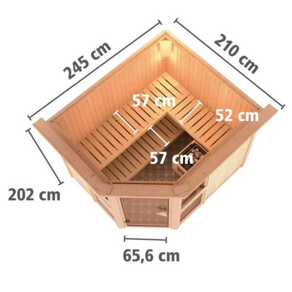 Met zijn buitenafmetingen van 231 x 196 cm biedt onze sauna voldoende ruimte voor alle eisen. De ligbank(en) zijn binnen gemonteerd op vierkante balken, die vanwege de systeemconstructie niet flexibel in hoogte zijn. Het onderste ligbed kan onder de bovenste bank worden geschoven, waardoor het interieur ruimer aanvoelt en er ruimte vrijkomt bij het schoonmaken. Er wordt altijd een oven beschermrooster meegeleverd. Alleen geschikt voor particulier huishoudelijk gebruik.