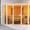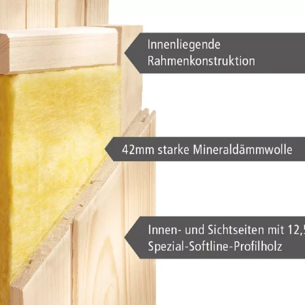 Met zijn buitenafmetingen van 231 x 196 cm biedt onze sauna voldoende ruimte voor alle eisen. De ligbank(en) zijn binnen gemonteerd op vierkante balken, die vanwege de systeemconstructie niet flexibel in hoogte zijn. Het onderste ligbed kan onder de bovenste bank worden geschoven, waardoor het interieur ruimer aanvoelt en er ruimte vrijkomt bij het schoonmaken. Er wordt altijd een oven beschermrooster meegeleverd. Alleen geschikt voor particulier huishoudelijk gebruik.