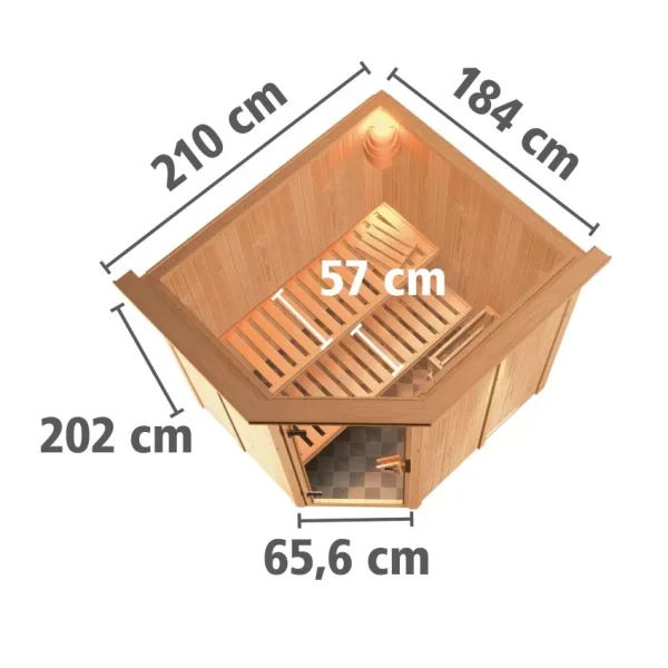 Onze systeembouw sauna van 68 mm dikke wandelementen biedt u een optimale prijs-prestatieverhouding en tegelijkertijd optimale isolatiewaarden. Dankzij de constructie van geprefabriceerde wandelementen is uw nieuwe sauna zeer snel op te bouwen en biedt u pure ontspanning. De wandelementen bestaan uit een frame constructie van 42 mm dik kanthout waarin hoogwaardige minerale wolisolatie is aangebracht. Dit isolatiemateriaal wordt vervolgens bekleed met hoogwaardig Softline-profielhout van het beste Scandinavische sparrenhout en geeft dus geen indicatie welke kwaliteiten er onder de houten bekleding schuilgaan. In tegenstelling tot de 38 mm of 40 mm massief houten sauna’s zijn de achterkanten van onze 68 mm sauna’s niet zichtbaar. Net als de plafondelementen zijn deze alleen aan de binnenzijde bekleed met geprofileerd hout. Aan de buitenkant zit stevig hardboard. De sauna heeft een elegante en praktische vooringang.