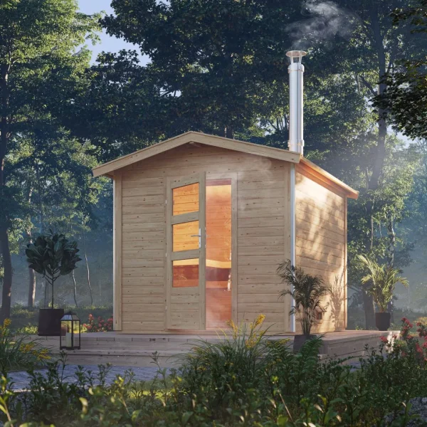 Het saunahuis is gemaakt van 38 mm dikke massief houten planken van Noords sparrenhout en wordt gemonteerd met behulp van een eenvoudig steek- en schroefsysteem , waardoor het saunahuis snel kan worden gemonteerd. Het sauna-interieur is voorzien van 3 sauna ligstoelen van espenhout , die zorgen voor een bijzonder comfortabele zit- en ligervaring. Met onze optioneel verkrijgbare accessoires, zoals de premium hoofdsteun, een ergonomische rugleuning of een LED-gekleurd licht, kunt u uw sauna naar wens uitrusten. Creëer eenvoudig uw persoonlijke, perfecte wellness oase. De kamers worden gescheiden door een gebronsde volledig glazen deur met gehard veiligheidsglas . Het dak is gemaakt van massief hout en wordt in het saunagedeelte versterkt door een frame constructie met minerale wolisolatie . Hierdoor kan er geen warmte uit de saunacabine ontsnappen.