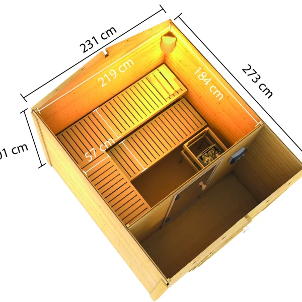 Voordat u naar de sauna gaat, kunt u zich in alle rust uitkleden in een aangrenzende kamer, na de sauna ontspannen op een comfortabele stoel of deze gebruiken om de accessoires op te bergen die u nodig heeft? De Elbe buitensauna met voorkamer biedt u deze en vele voordelen . Met een totale buitenafmeting van 231 x 273 x 235 cm (B/D/H) creëert het huis de nodige ruimte voor een saunacabine voor ontspanning en een praktische voorkamer. Zo kunt u heerlijk ontspannen in de saunaruimte van 219 x 184 cm en vervolgens in de voorkamer van 219 x 73 cm (B/D) stappen om de volledige ontspanning op een comfortabele ligstoel op uw lichaam te laten werken.