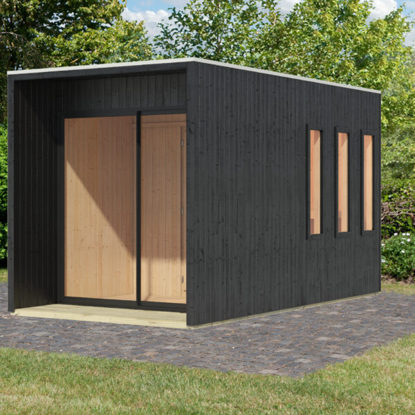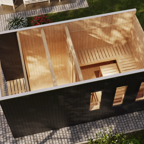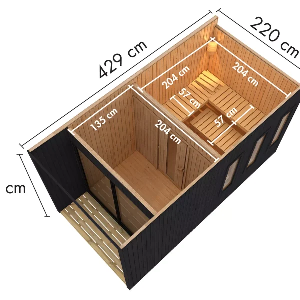 Het saunahuis bestaat uit geprefabriceerde elementen van 73 mm dikke wandplaten van Scandinavisch sparrenhout. Met een totaalformaat van 217 cm x 429 cm biedt hij voldoende ruimte voor ongestoorde wellness-uren in uw eigen tuin. Uiteraard is de saunaruimte ook voldoende gedimensioneerd met een oppervlakte van 204 cm x 204 cm. Binnen bieden 3 saunabanken ruimte voor ontspanning. Het elegante en praktische dak biedt bescherming tegen weersinvloeden van bovenaf.