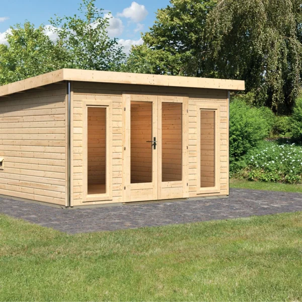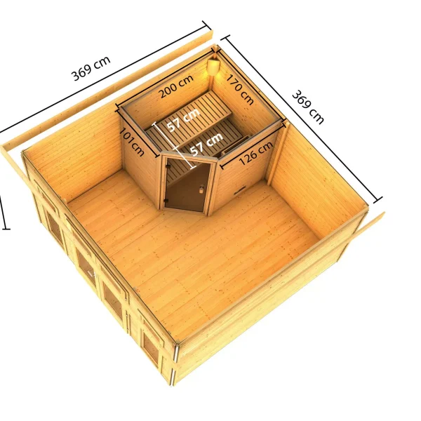 Het saunahuis heeft een wanddikte van 38 mm en wordt aan elkaar geschroefd met behulp van een plug-en-schroefsysteem. Hij heeft een buitenmaat van 369 x 369 cm en een hoogte van 229 cm. U betreedt de woning via een extra hoge glazen dubbelvleugeldeur met cilinderslot. Voor een moderne uitstraling heeft het saunahuis aan de randen een Chromeline hoekverbinding, waardoor randen optimaal verborgen blijven.