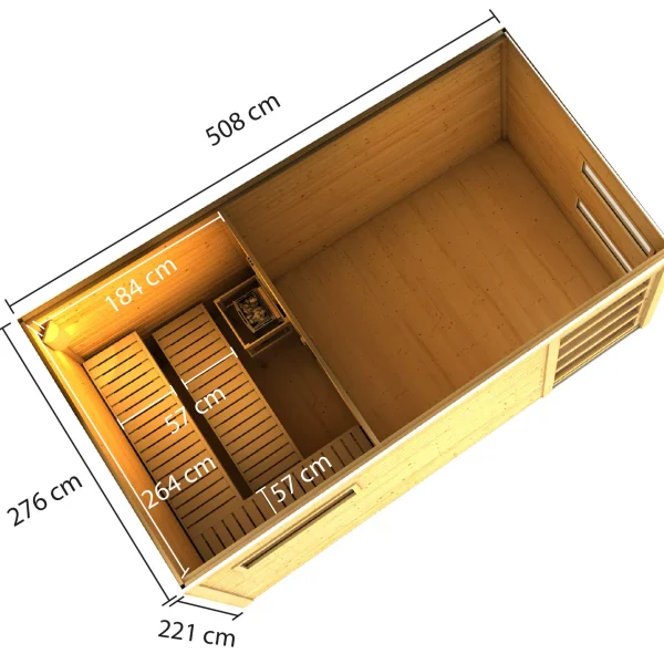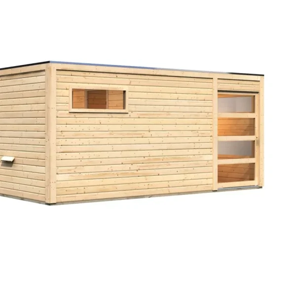 Het grote voordeel van de Hygge buitensauna is de ruime voorkamer . Deze bereikt u via een enkele schuifdeur met vier lichtuitsparingen van kunstglas en een haakslot inclusief drie sleutels. Gebruik bijvoorbeeld de voorkamer om uw keukengerei op te bergen voor een perfecte saunasessie of creëer een plek om te ontspannen na een sauna met een comfortabele fauteuil. U betreedt de saunaruimte van 184 x 264 (B/D) cm via een gebronsde volledig glazen deur van 8 mm dik enkel veiligheidsglas.