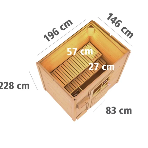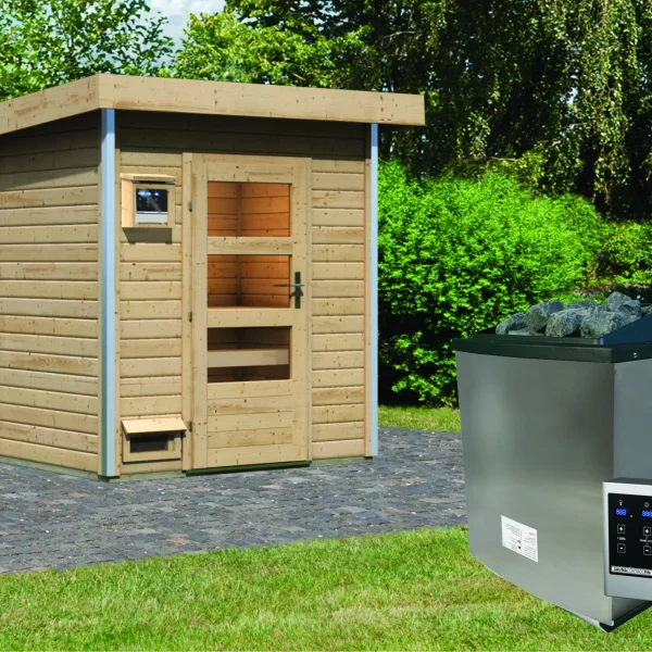 Om de besturingseenheid tegen vocht te beschermen, wordt een besturingsbeschermdoos meegeleverd. Het beschermende lessenaarsdakhuis is gemaakt van massief hout en biedt, voorzien van een optioneel verkrijgbare zelfklevende dakfolie, ideale bescherming tegen weersinvloeden. Om ervoor te zorgen dat de warmte binnenin niet kan ontsnappen, wordt een tweede plafond van een 42 mm dikke frameconstructie met minerale isolatiewol geplaatst. De sauna wordt afgesloten door middel van een  enkele vleugeldeur met een cilinderslot inclusief drie sleutels. Pas het saunahuis aan uw tuinsfeer aan en kies uit twee deurvarianten. De moderne enkele vleugeldeur heeft drie lichtuitsparingen van isolatieglas. Deze laten licht binnen in het interieur en zorgen zo overdag voor een natuurlijke lichtbron. Of misschien geeft u de voorkeur aan een enkele vleugeldeur met twee langwerpige lichtuitsparingen en isolatieglas met matglaslook voor een optisch gesloten ruimte, hier kunt u geheel naar eigen smaak beslissen.