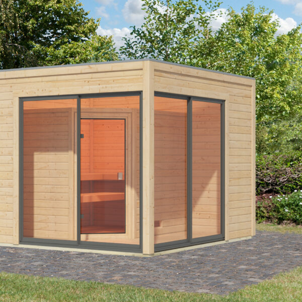 Het TSura 3 saunahuis met modern plat dak biedt een hoogwaardige en moderne oplossing waarmee u uw tuin kunt omtoveren tot een oase van rust en ontspanning. Gemaakt van massief houten wanden en een plat dak van massief hout met een aluminium randstrip, is hij ontworpen om jarenlang robuust en duurzaam te zijn.