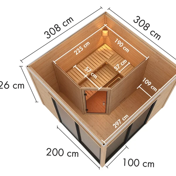 Het Sura 3 saunahuis heeft ook veel praktische voordelen. Dankzij de solide constructie kun je rekenen op jarenlange duurzaamheid. Daarnaast is het tuinhuis gebouwd met een dubbele tand- en groefverbinding, wat de stabiliteit van de woning nog verder vergroot. Het waterafstotende profiel draagt ook bij aan de lange levensduur. Met een afmeting van (BxDxH) 308 x 308 x 242 cm is hij geschikt voor diverse toepassingen: als feestruimte in de zomer of als toevluchtsoord in de winter, van de Terning 3 zult u jarenlang plezier hebben.