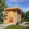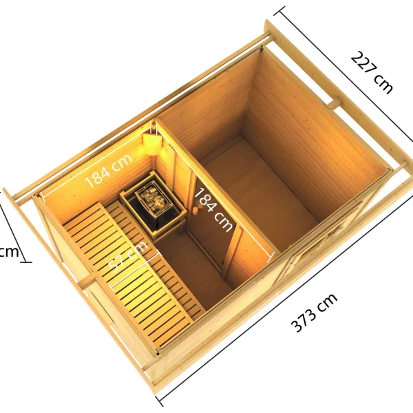 Wilt u zich even rustig uitkleden in een aangrenzende kamer voordat u naar de sauna gaat, na een sauna sessie heerlijk ontspannen op een comfortabele stoel of deze gebruiken om de benodigde accessoires op te bergen? De buitensauna Tajo 1 met voorkamer biedt u deze en vele voordelen. Met een totale buitenafmeting van 337 x 196 x 239 cm (B/H/D) creëert het huis de nodige ruimte voor een saunacabine voor ontspanning en een praktische voorkamer.