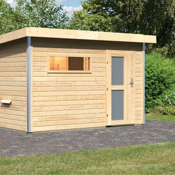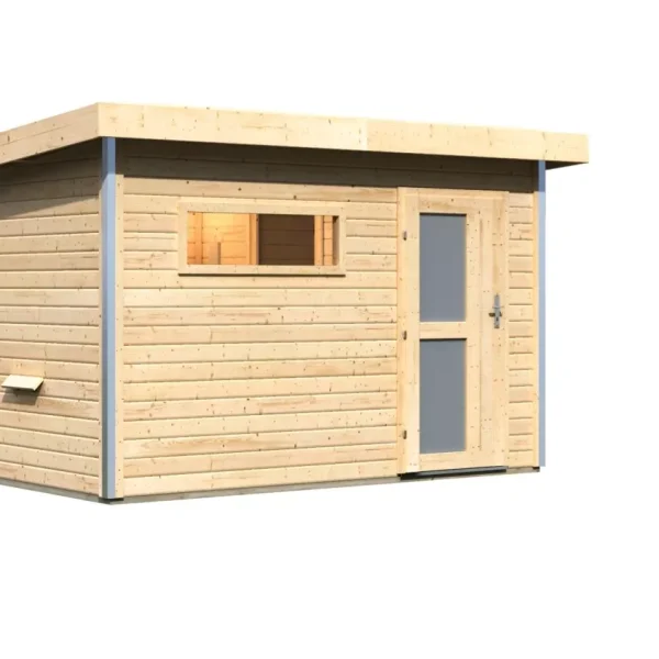 Het saunahuis is gemaakt van 38 mm dikke massief houten planken van Noords sparrenhout en wordt gemonteerd met behulp van een eenvoudig plug – en-schroefsysteem, waardoor het saunahuis snel kan worden gemonteerd. Hij is verkrijgbaar in de moderne kleur terragrijs of in het klassieke natuurlijke hout.