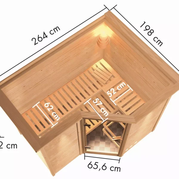 Breid je mogelijkheden uit met de optioneel verkrijgbare biologische combi-oven van 9 kW. Naast een klassieke Finse sauna heeft u de keuze uit een kruidenstoombehandeling, een stoombad en een familiesauna. Hierdoor is het een saunabeleving voor het hele gezin. Laat u overtuigen door de gunstige effecten van een saunabad. Bij regelmatig gebruik voelt u zich niet alleen aanzienlijk meer ontspannen. Bovendien heeft het een positieve invloed op de stofwisseling, verfijnt het de teint en ondersteunt het stressvermindering. Om een bijzonder saunagevoel te creëren is de sauna voorzien van saunaligstoelen en een hoofdsteun. Een extra breed saunabed met een breedte van 62 cm biedt u bijzonder aangenaam ligcomfort. Een ovenveiligheidsrooster beschermt u tegen brandwonden veroorzaakt door de saunakachel. Met een optioneel verkrijgbare Salt Crystal Vital Sole of de Salt Crystal Light kunt u uw luchtwegen vrijmaken en diep in en uit ademen. Geniet van de talrijke voordelen van een sauna en creëer een plek van rust met de Dublin 2 massief houten sauna.