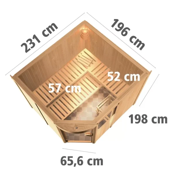 Met zijn buitenafmetingen van 231 x 196 cm biedt onze sauna voldoende ruimte voor alle eisen. De ligbank(en) zijn binnen gemonteerd op vierkante balken, die vanwege de systeemconstructie niet flexibel in hoogte zijn. Het onderste ligbed kan onder de bovenste bank worden geschoven, waardoor het interieur ruimer aanvoelt en er ruimte vrijkomt bij het schoonmaken. Er wordt altijd een oven beschermrooster meegeleverd. Alleen geschikt voor particulier huishoudelijk gebruik.