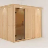 Onze systeembouw sauna van 68 mm dikke wandelementen biedt u een optimale prijs-prestatieverhouding en tegelijkertijd optimale isolatiewaarden. Dankzij de constructie van geprefabriceerde wandelementen is uw nieuwe sauna zeer snel op te bouwen en biedt u pure ontspanning. De wandelementen bestaan uit een frame constructie van 42 mm dik kanthout waarin hoogwaardige minerale wolisolatie is aangebracht. Dit isolatiemateriaal wordt vervolgens bekleed met hoogwaardig Softline-profielhout van het beste Scandinavische sparrenhout en geeft dus geen indicatie welke kwaliteiten er onder de houten bekleding schuilgaan. In tegenstelling tot de 38 mm of 40 mm massief houten sauna’s zijn de achterkanten van onze 68 mm sauna’s niet zichtbaar. Net als de plafondelementen zijn deze alleen aan de binnenzijde bekleed met geprofileerd hout. Aan de buitenkant zit stevig hardboard. De sauna heeft een elegante en praktische vooringang.