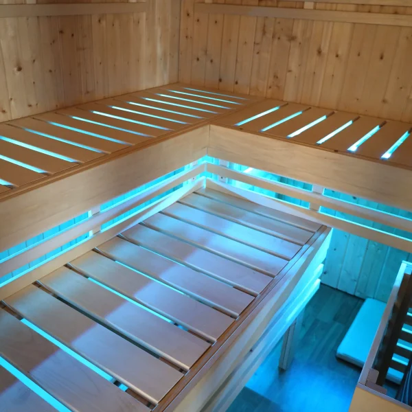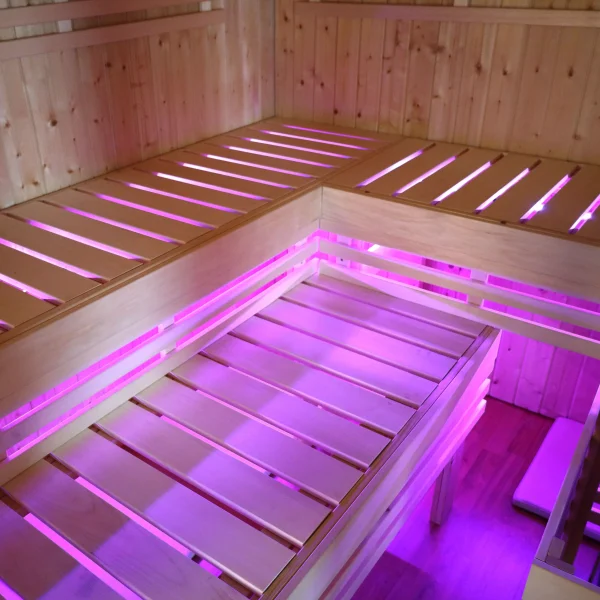 Dit LED-verlichtingssysteem, discreet geplaatst achter de rugleuningen of onder de bank, zorgt voor een ontspannende, feel-good sfeer in uw sauna of infraroodcabine.