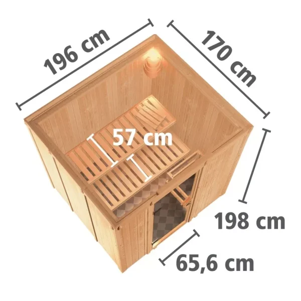 Met zijn buitenafmetingen van 196 cm x 170 cm biedt onze sauna voldoende ruimte voor alle eisen. De ligbank(en) zijn binnen gemonteerd op vierkante balken, die vanwege de systeemconstructie niet flexibel in hoogte zijn. Het onderste ligbed kan onder de bovenste bank worden geschoven, waardoor het interieur ruimer aanvoelt en er ruimte vrijkomt bij het schoonmaken. Er wordt altijd een oven beschermrooster meegeleverd. Alleen geschikt voor particulier huishoudelijk gebruik.