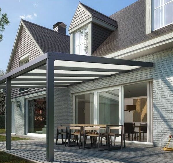 Met deze antraciete Climalux van Skylux kan je jouw huis uitbreiden naar de tuin. De veranda zorgt ervoor dat je altijd droog buiten kan zitten. Je kan er daarnaast kiezen om de overkapping in te richten als buitenkeuken, eetkamer of serre. De dakplaten zijn gemaakt van polycarbonaat of glas en daarom behoudt je altijd het daglicht.