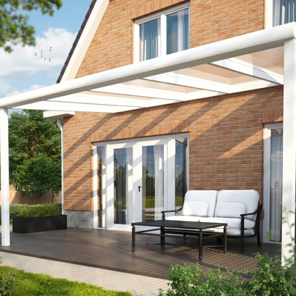 Met deze witte Climalux van Skylux kan je jouw huis uitbreiden naar de tuin. De veranda zorgt ervoor dat je altijd droog buiten kan zitten. Je kan er daarnaast kiezen om de overkapping in te richten als buitenkeuken, eetkamer of serre. De dakplaten zijn gemaakt van polycarbonaat of glas en daarom behoudt je altijd het daglicht.
