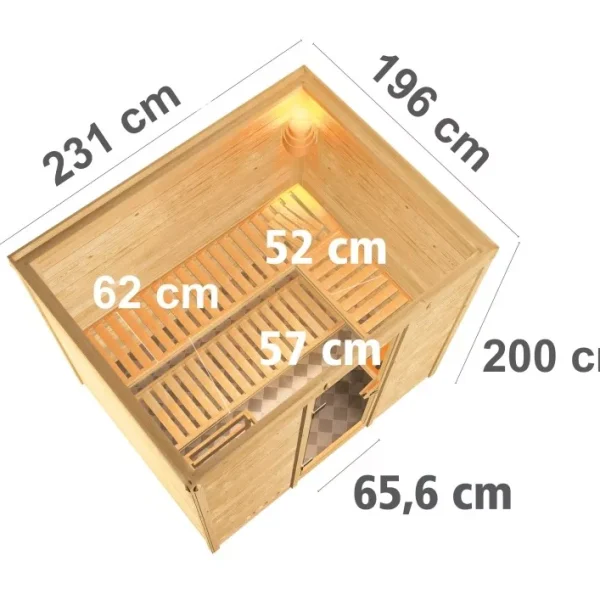 Een optionele dakrand inclusief 3 LED-spots zet de sauna vakkundig in scène. Kies één van de vier mogelijke deurvarianten en pas uw sauna aan uw eigen wensen aan. Of het nu energiezuinig is met een houten deur met isolatieglas, klassiek met een gebronsde volledig glazen deur, modern met een volledig glazen deur in grafietkleur of gewoon met een heldere volledig glazen deur. Hier zit gegarandeerd iets voor u tussen. Met een buitenafmeting van 236 x 184 x 209 cm (B/D/H) heeft de Sonara sauna het ideale formaat om te ontspannen en zich goed te voelen.