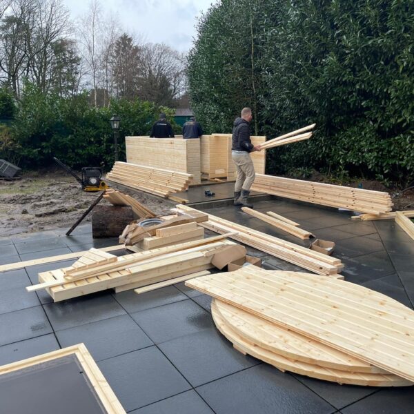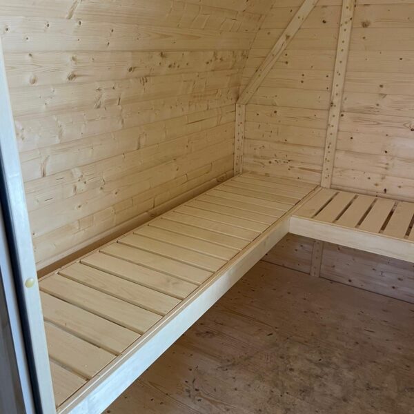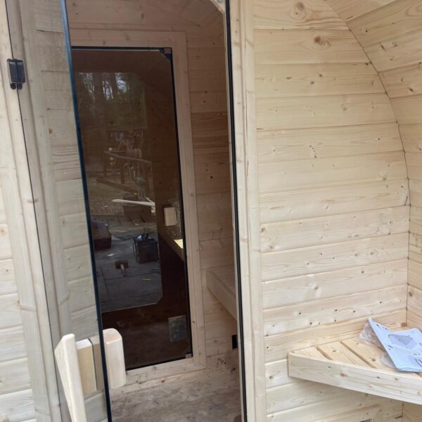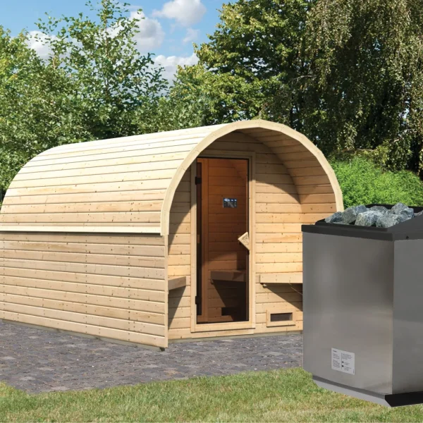 Het tonhuis van 38 mm dik Scandinavisch sparrenhout wordt gemonteerd met behulp van een plug-schroefsysteem. Met een totale afmeting van 219 cm x 385 cm biedt hij voldoende ruimte om te ontspannen. Binnen bieden 3 vurenhouten sauna banken ruimte om op te liggen. Het aantrekkelijke en praktische tondak biedt bescherming tegen weersinvloeden van bovenaf. Het saunahuis is te betreden via een gebronsde geheel glazen deur met magneetslot. Een oven beschermrooster en alle benodigde schroeven en fittingen, evenals een gedetailleerde montagehandleiding, worden uiteraard meegeleverd. Tevens beschikt dit model over een prachtige omkleed ruimte binnen in de sauna.