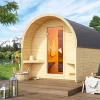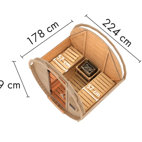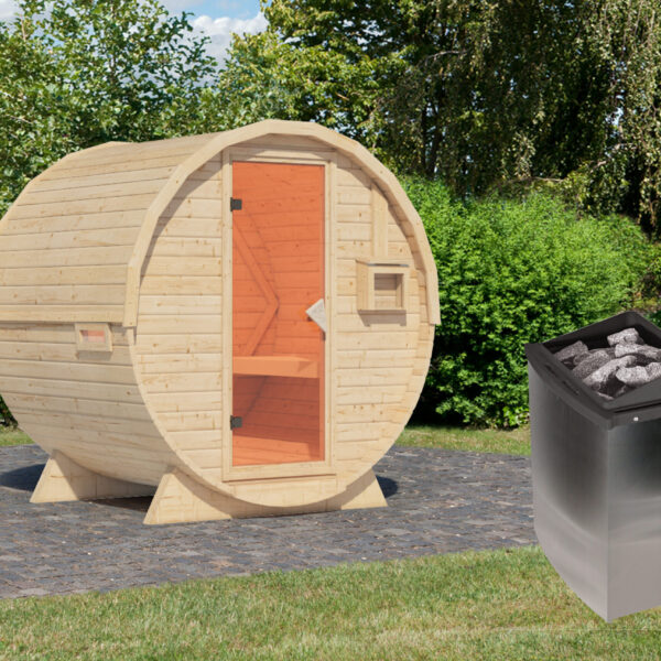 Niet alleen visueel zijn de vatensauna’s een echte blikvanger, ook technisch gaat KARIBU mee met de tijd en heeft de vatensauna’s perfect ontwikkeld. In tegenstelling tot het oude klemringontwerp worden deze nu geleverd in een praktisch en eenvoudig te monteren plug-/schroefsysteem. Dankzij de 10 mm dikkere voor- en achterkant wordt de warmte optimaal vastgehouden in de sauna. Hierdoor is het eenvoudig om het energieverbruik te verminderen. De extra grote deur en de stahoogte van 200 cm beloven maximaal comfort.